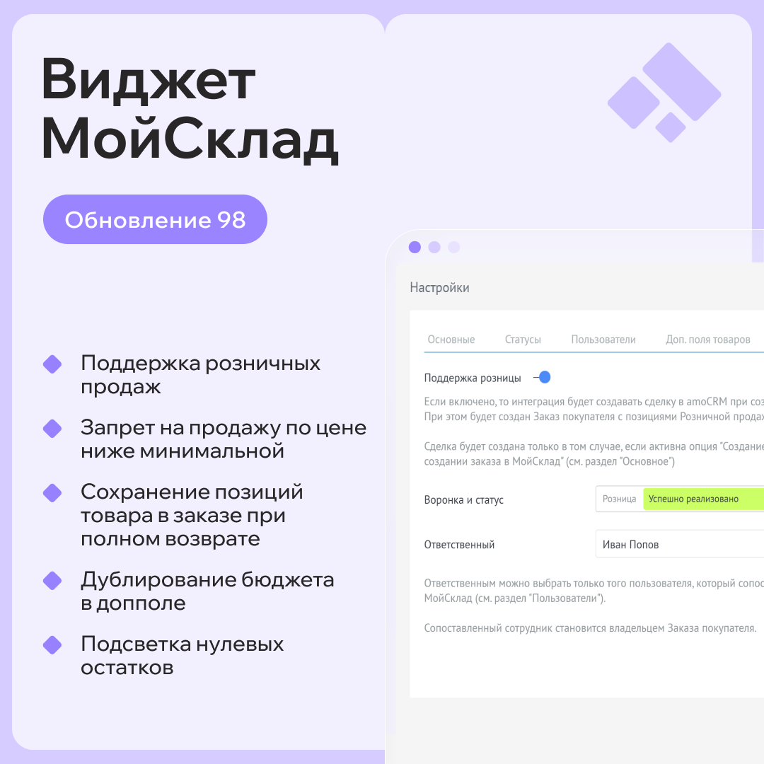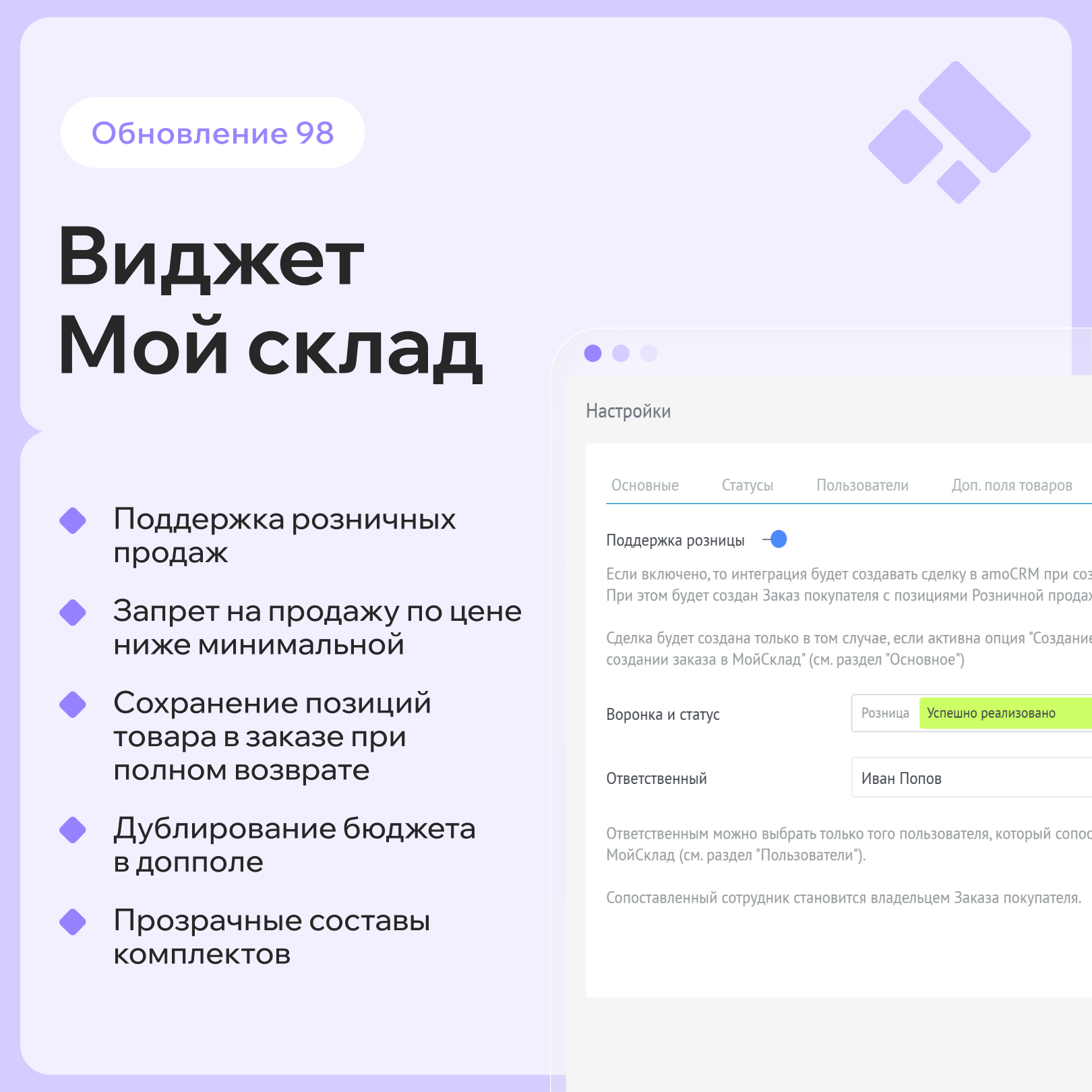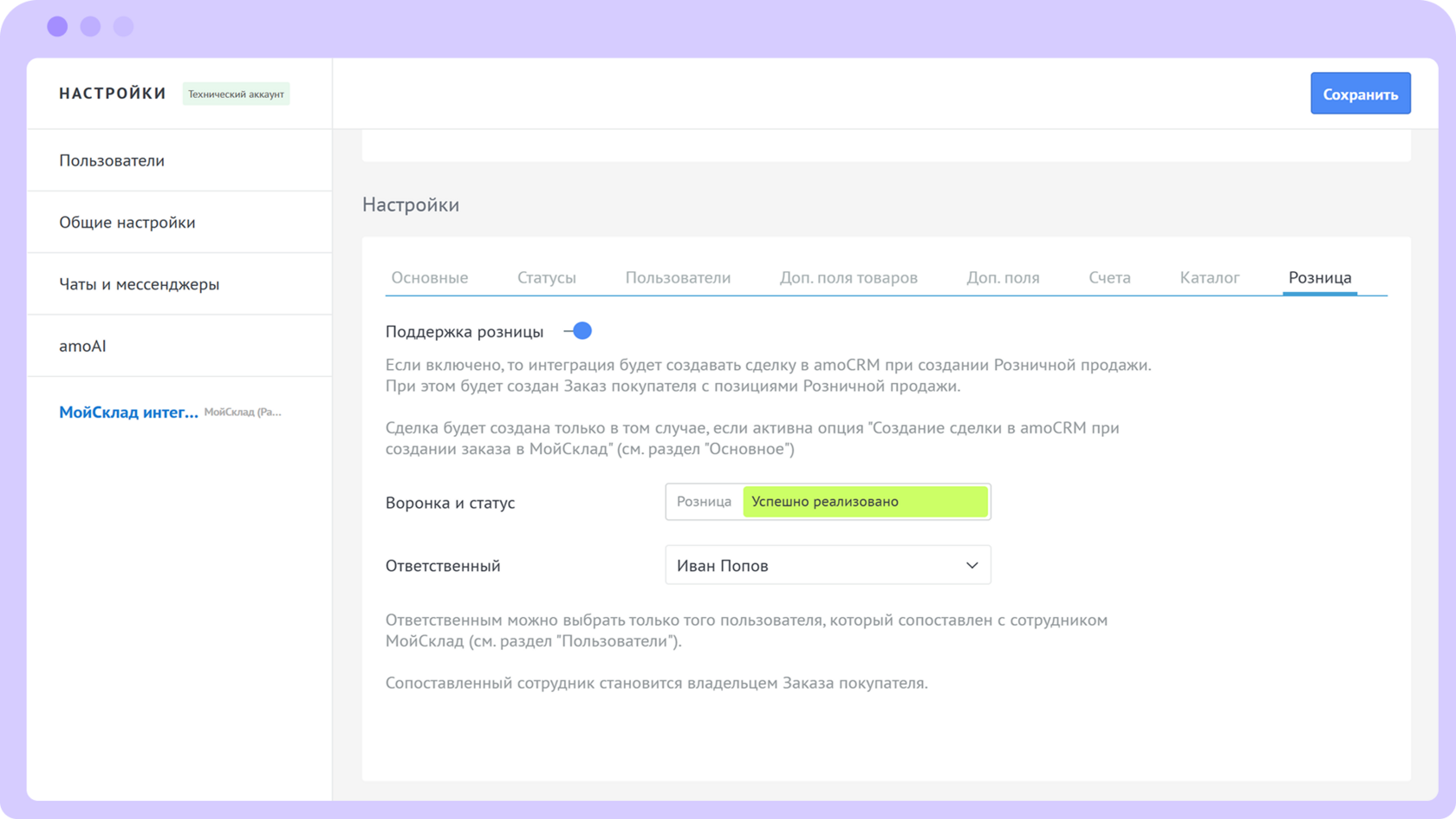 Теперь интеграция автоматически создаёт заказ покупателя в МойСклад и сделку в amoCRM даже для розничных продаж.