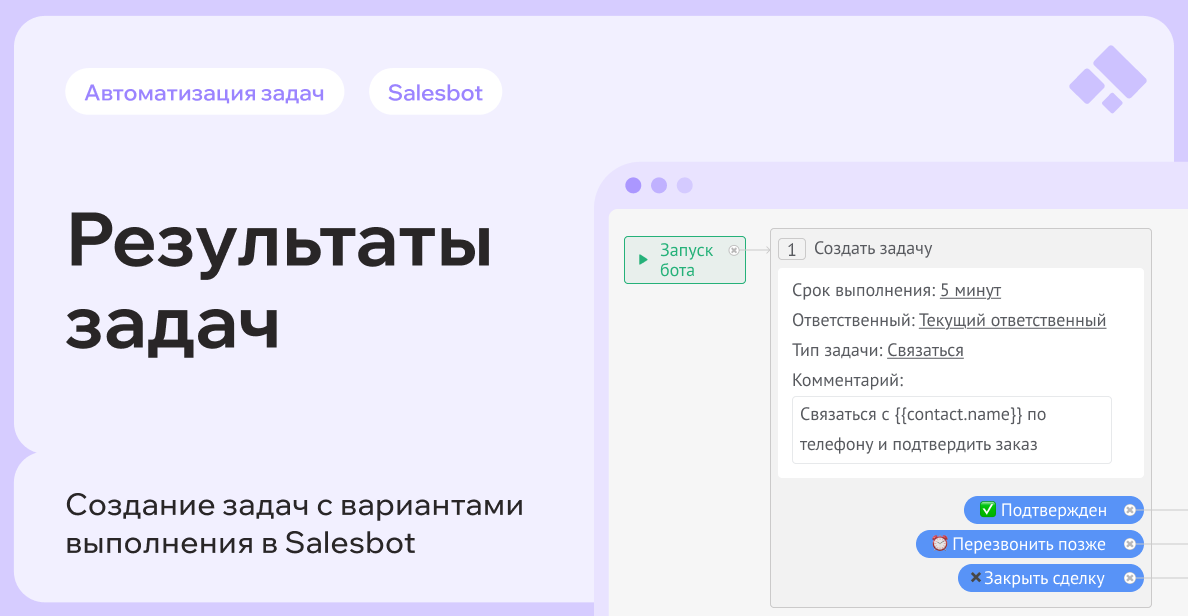 - Позволяет настраивать кнопки с результатами задач, которые автоматически запускают дополнительные действия в SalesBot.
