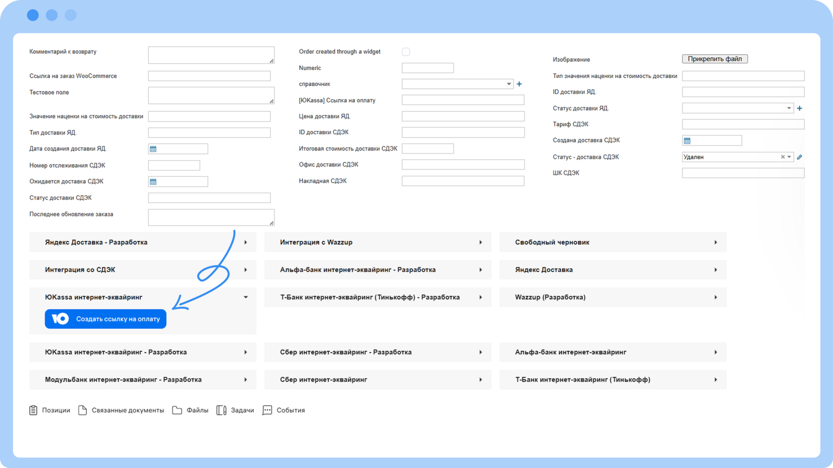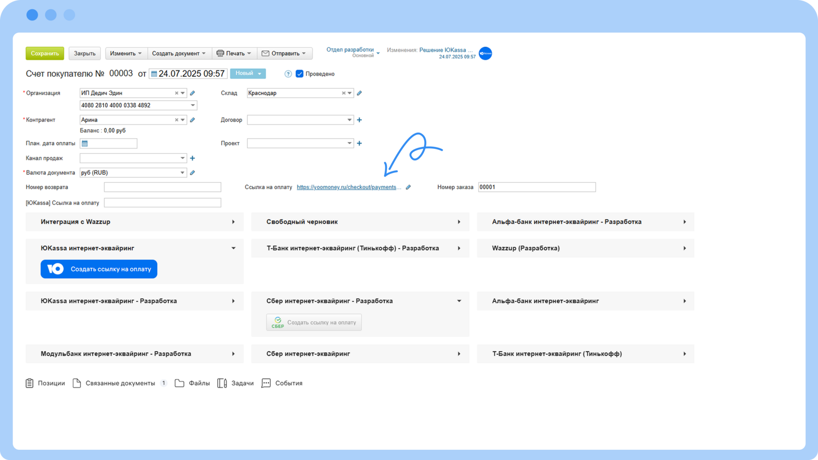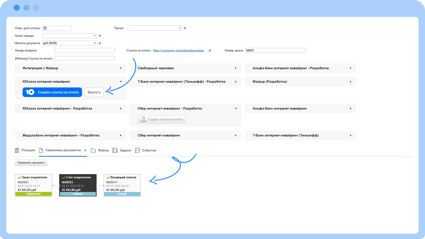 1. При оплате заказа будет происходить обновление статуса счета на «Оплачен».2. Если потребуется сделать возврат оплаты клиенту, в карточке успешно оплаченного счета можно нажать «Сделать возврат».
