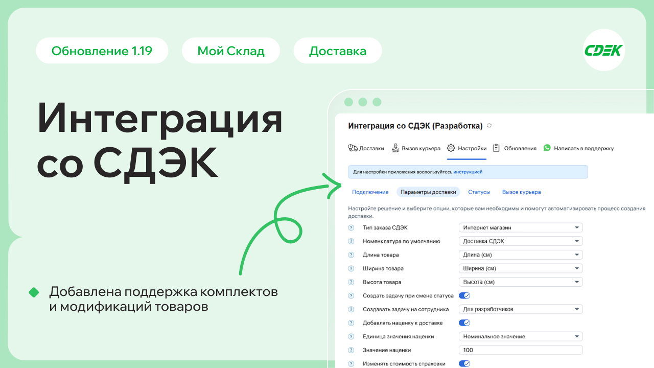 Теперь решение работает с комплектами и модификациями на всех типах доставки + авторасчет веса и габаритов.