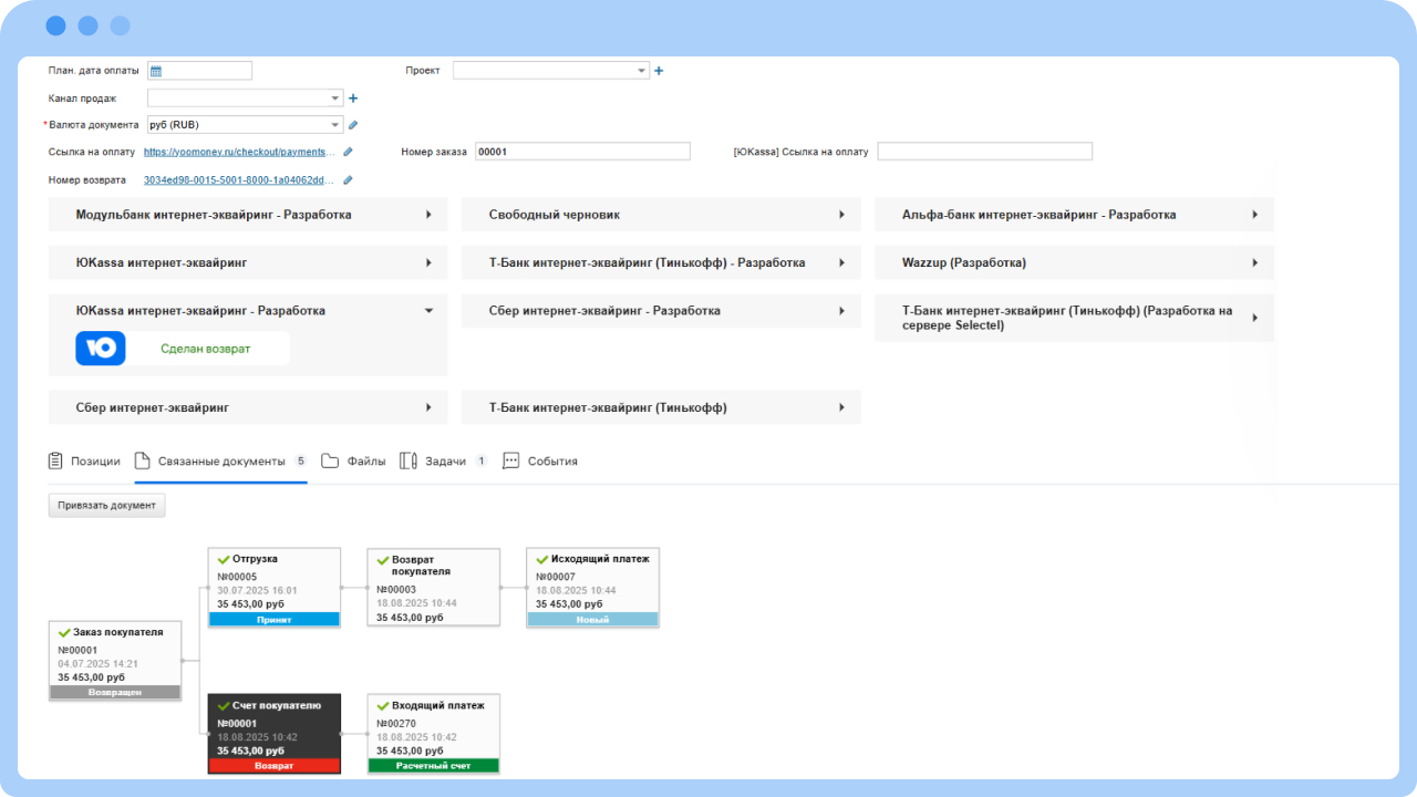 📌 Все связи документов (заказ → отгрузка → возврат → платеж) формируются автоматически.