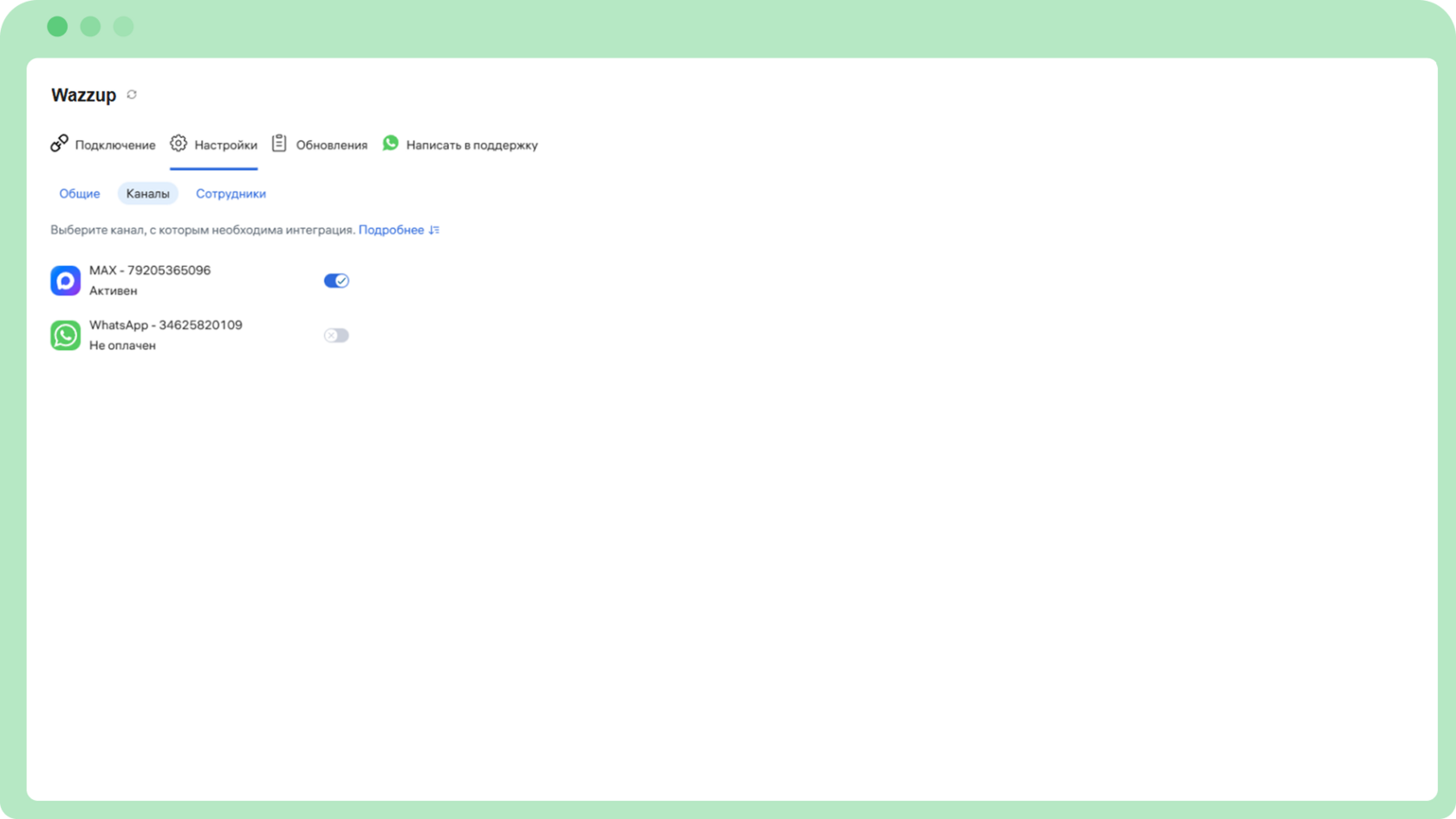 💬 Подключение любых доступных каналов Wazzup