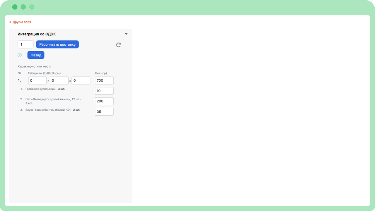 - Если доставка создаётся из Отгрузки, в СДЭК уходит её номер (если включена соответствующая опция).