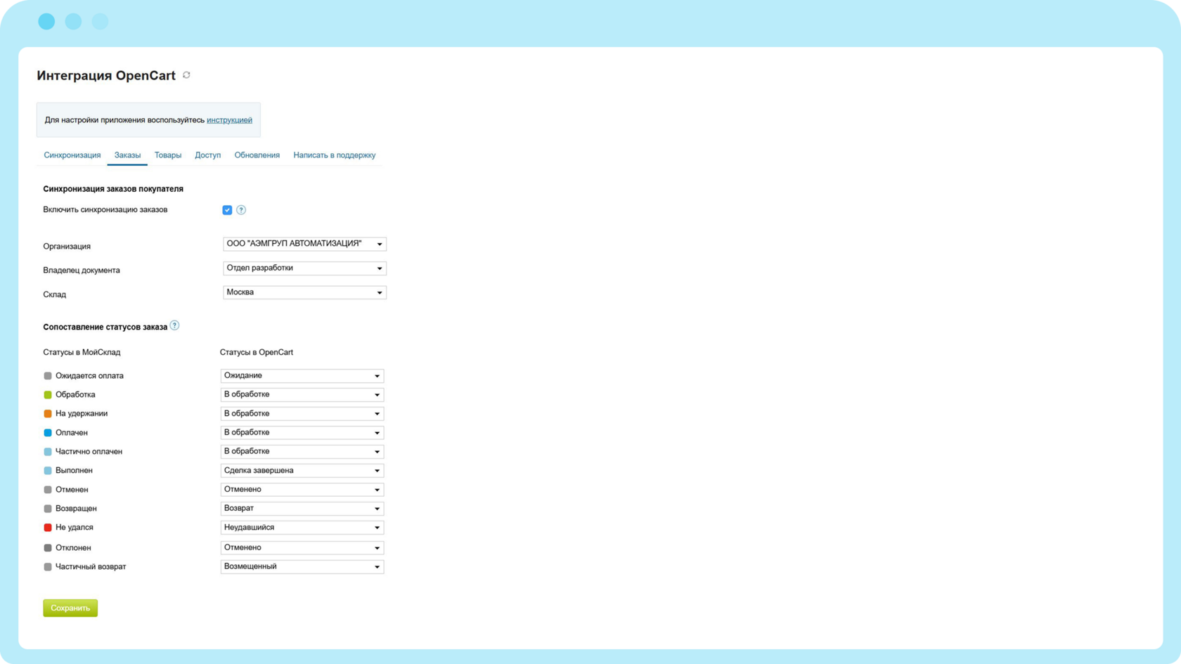 - Синхронизирует статусы заказов и товарные позиции